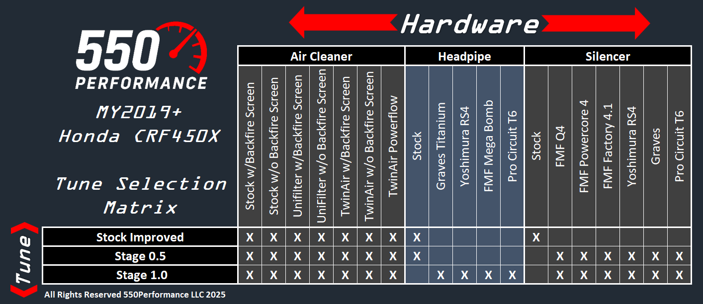 550Performance LLC provides free tune updates for existing CRF450X tune customers. If you initially purchase the Stock Improved tune and later upgrade to a full exhaust system, we will update your ECU at no additional cost—customers are only responsible for shipping and handling fees.